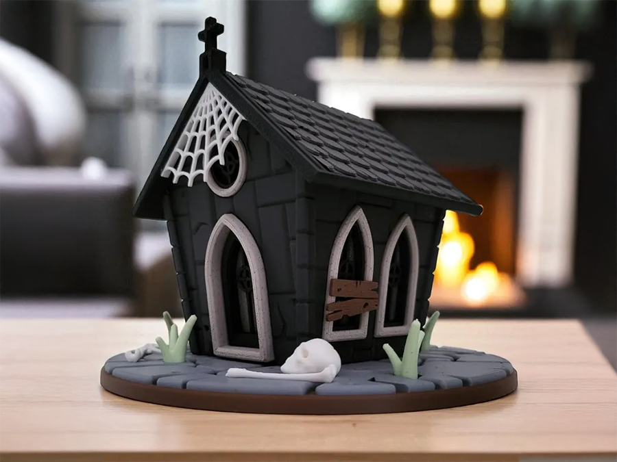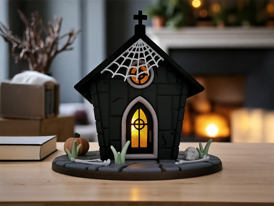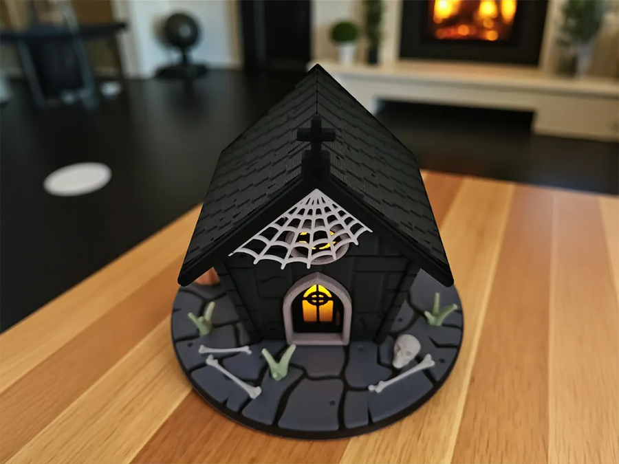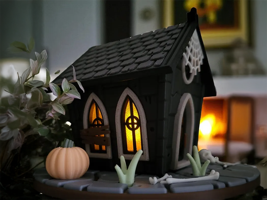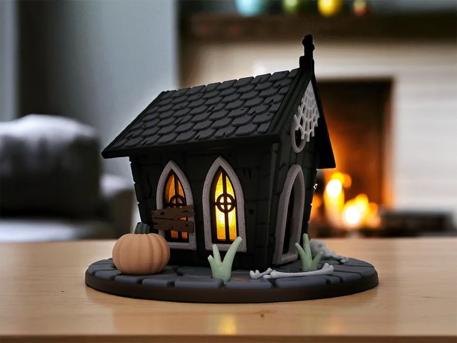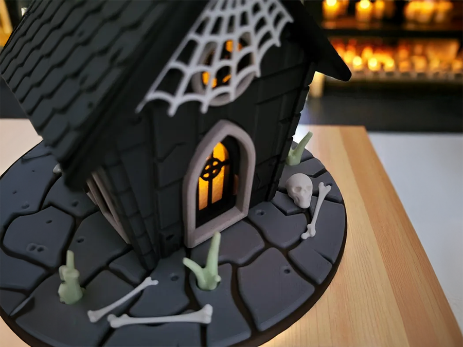gestaltete Details wie gotische Fenster, ein Spinnennetz am Giebel, einen