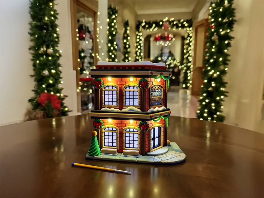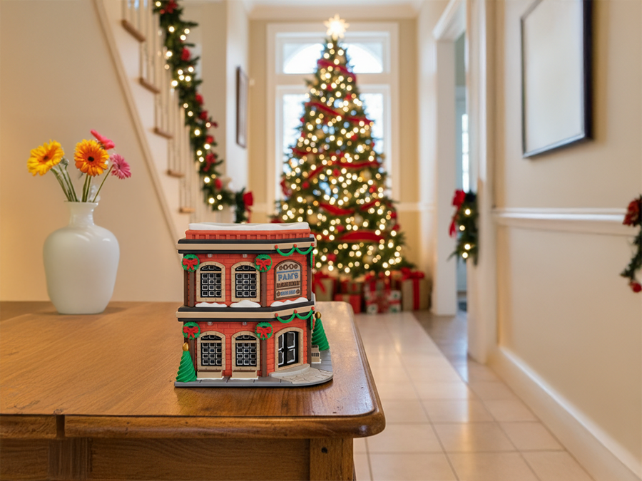 Detailreicher Modellbausatz im festlichen Weihnachtsdorf-Stil – liebevoll gestaltetes Gebäude mit klassischen Ziegeln, Schneeakzenten, Türgirlanden, Tannenbäumen und Bänken.