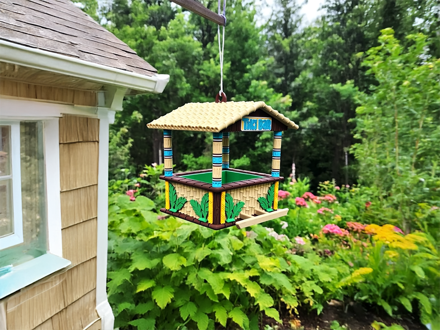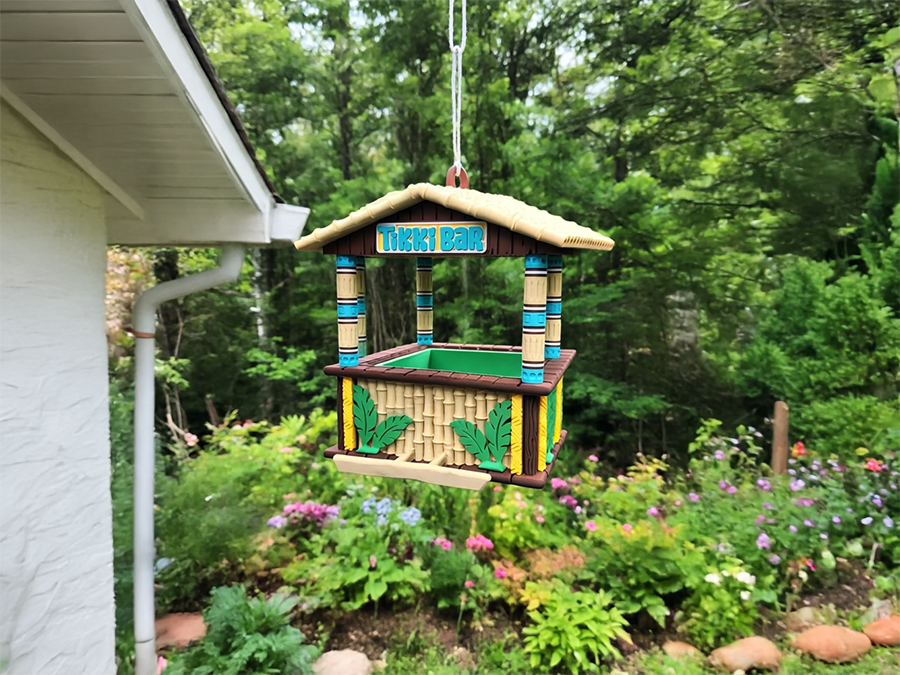 außergewöhnlichen Vogel-Futterhäuschen im Tikki-Bar-Design.