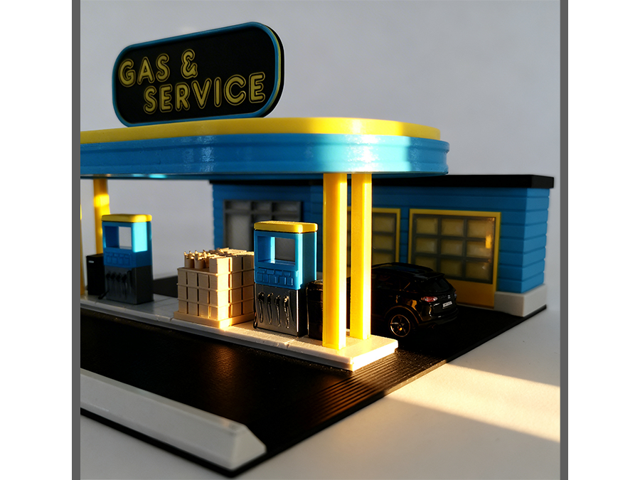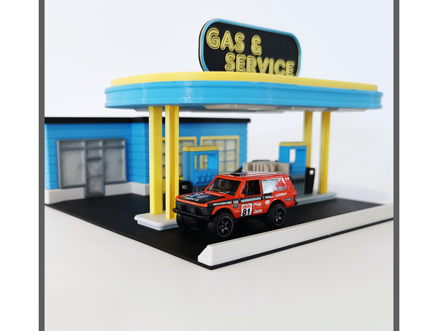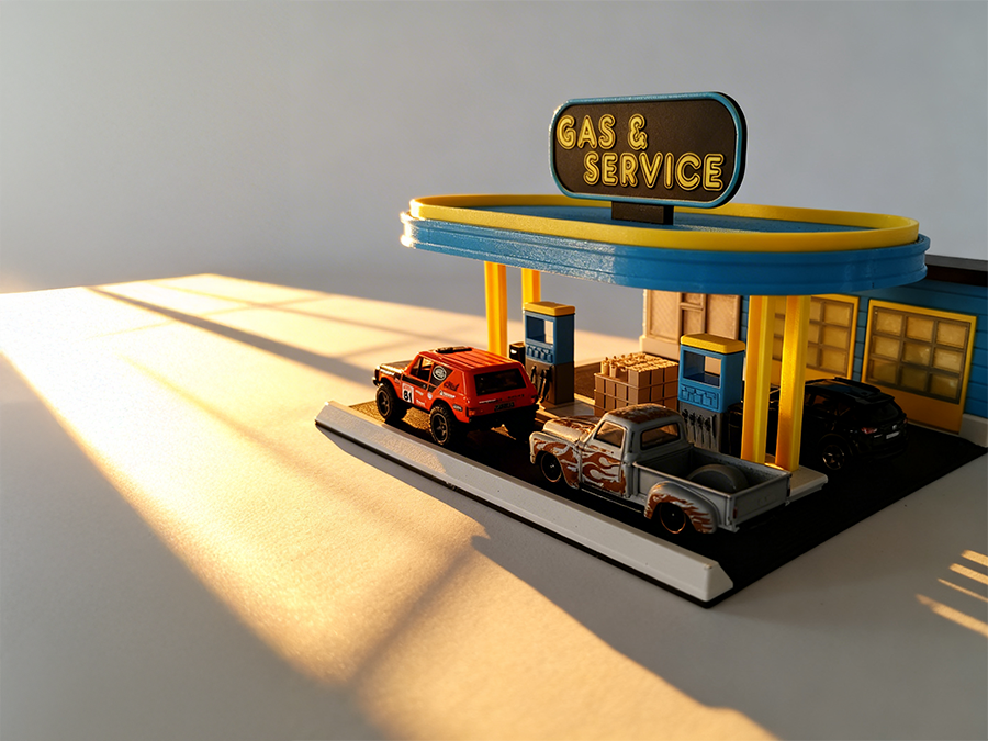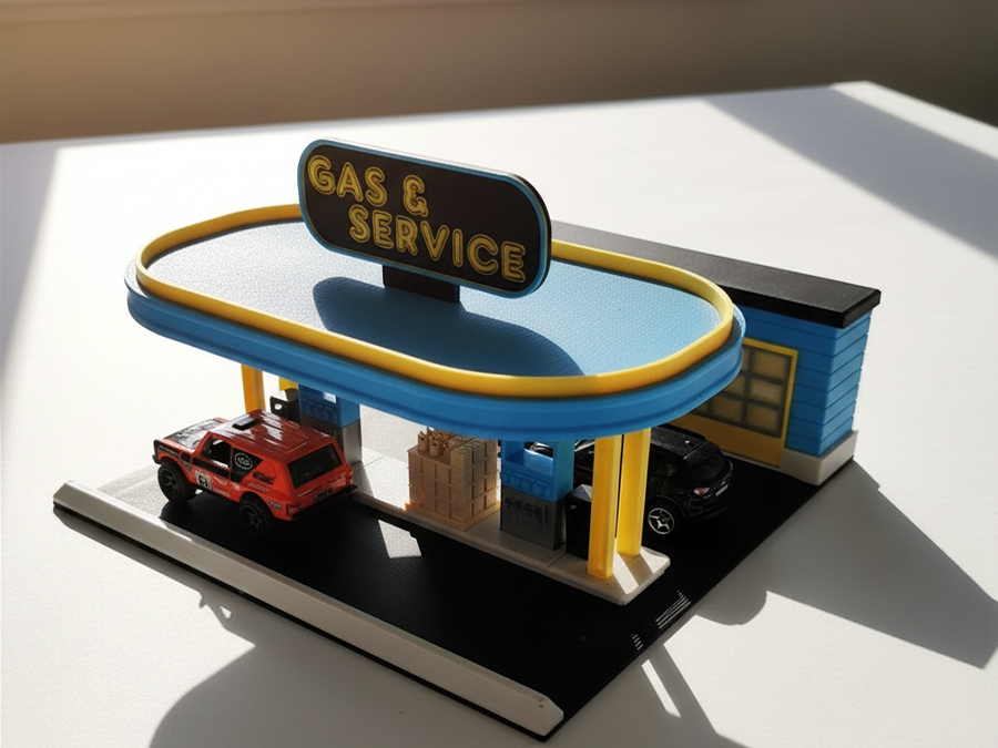 Erweitern Sie Ihre Modellauto-Sammlung mit unserer Gas & Service Tankstelle – einem detailreichen Diorama-Bausatz im Maßstab 1:64. Dieses 3D-gedruckte Miniaturgebäude ist perfekt geeignet für Hot-Wheels, Matchbox und andere Diecast-Modellautos.