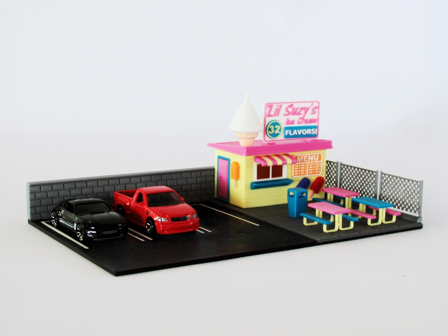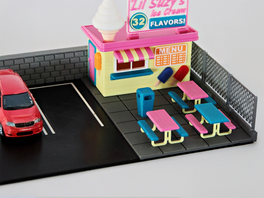 Bringen Sie sommerliche Stimmung in Ihre Miniaturwelt mit unserem Ice Cream Shop – einem liebevoll gestalteten Eisladen! Dieses detailreiche 3D-gedruckte Diorama im Maßstab 1:64 ist perfekt für Hot-Wheels, Matchbox und andere Diecast-Modellautos.