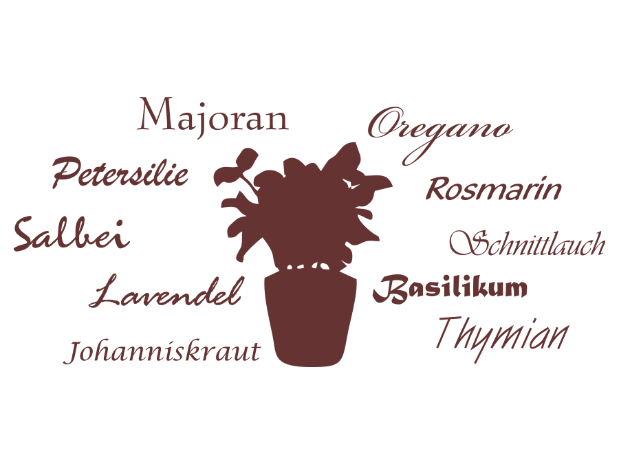 Das Motiv zeigt eine Kräuterpflanze und rundherum verschiedene Schriftarten mit unterschiedlichen Gewürznamen.