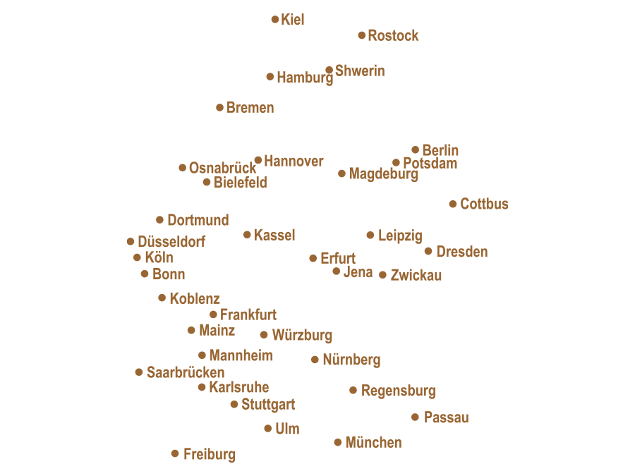Das Motiv zeigt deutsche Städte als Umriss von Deutschland.