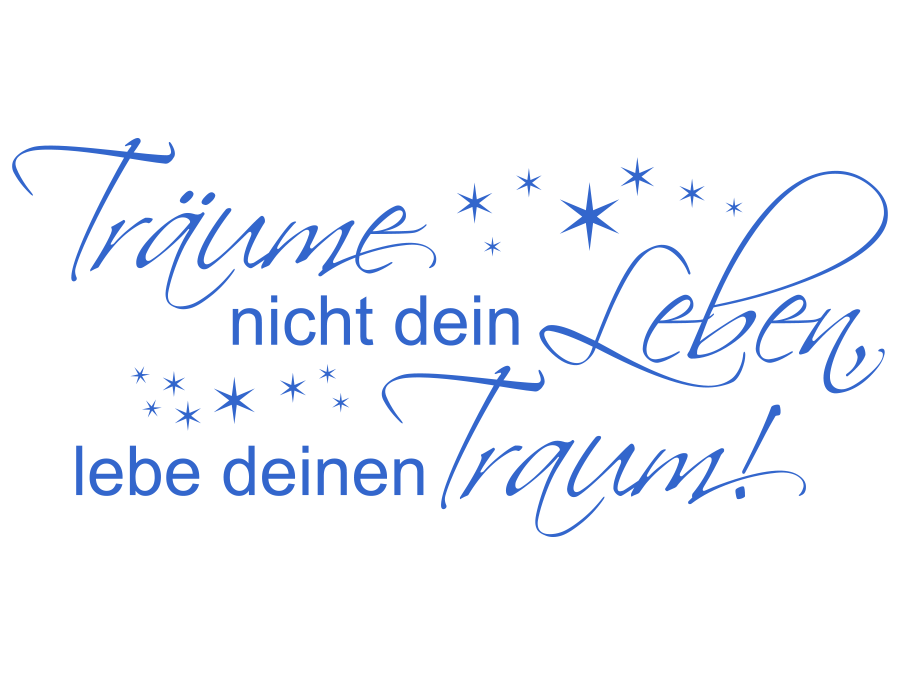 Dieser Wandtattoo Spruch gibt einem nicht nur eine positive Sicht auf das Leben, sondern sieht aufgrund der Schrift und den Sternen einzigartig aus. Dieses Motiv ist auf jeder Wand ein Hingucker. Der Spruch „Träume nicht dein Leben, sondern Lebe deinen Traum“ bedeutet, dass wir unsere Träume nicht nur in unseren Träumen belassen sollten. Man soll aufwachen und die Träume verwirklichen!