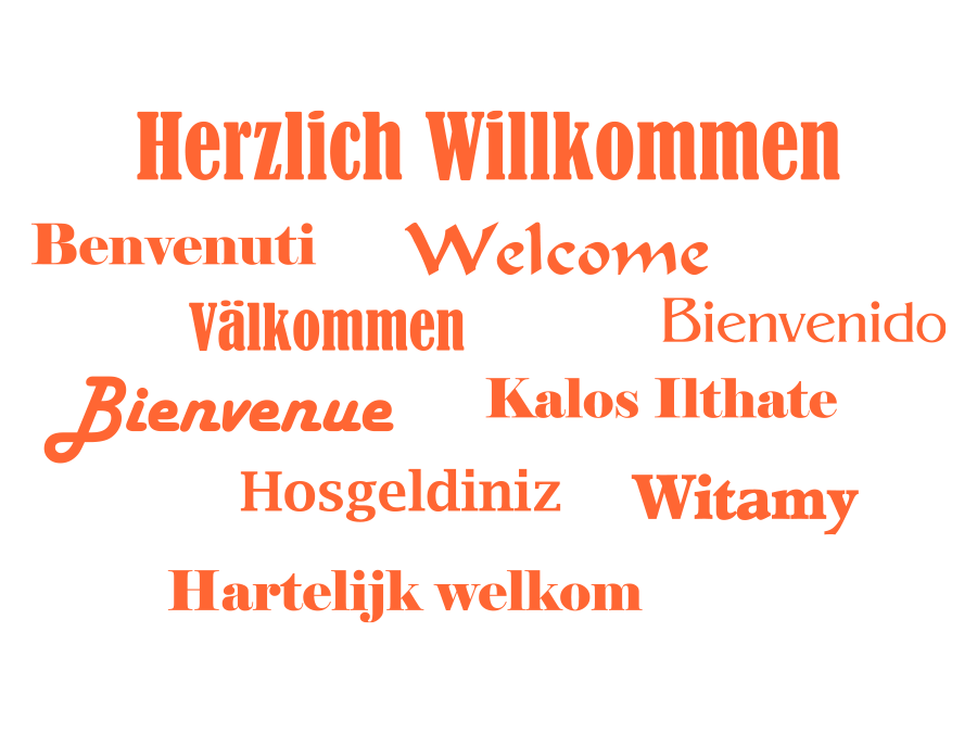 Das Motiv zeigt das Wort Willkommen in verschiedenen Sprachen und Schriften.