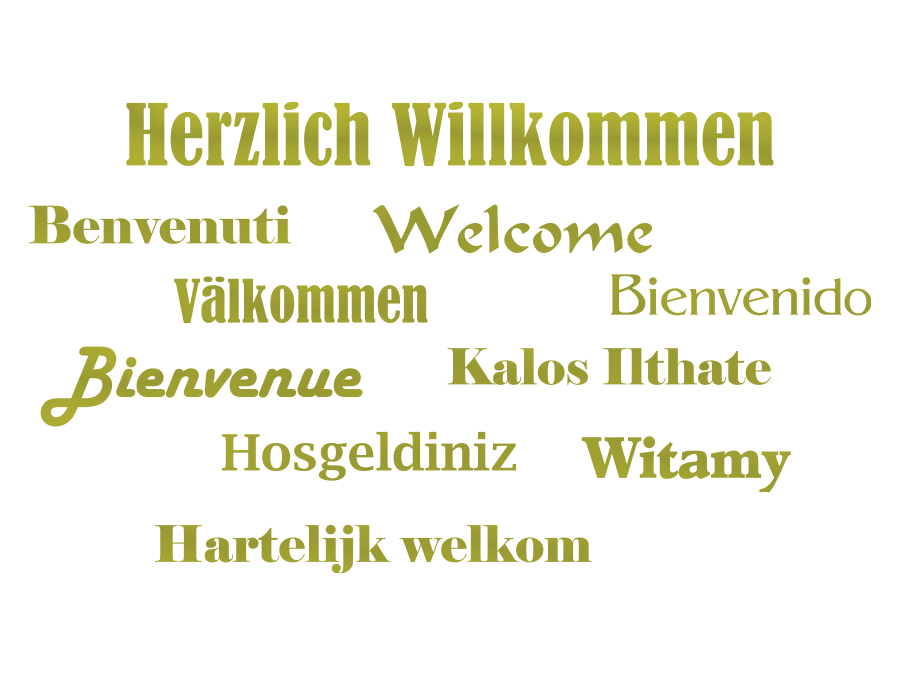 Das Motiv zeigt das Wort Willkommen in verschiedenen Sprachen und Schriften.
